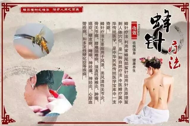 蜂针疗法(bee venom therapy) 是利用蜜蜂尾部蜇针运用针灸原理蜇刺人体穴位,是一种自然疗法,利用活蜜蜂螫器官为针具,循人体经络、皮部、穴位施行不同针刺方法,将蜂毒注入皮肤以防治疾病,蜂针既给人体经络穴位以机械刺激,同时自动注入皮内适量的蜂针液,具有独特的药理作用,其针后继发局部潮经充血,以兼具温灸效应。可见它是针、药、灸相互结合的复合型刺灸法。