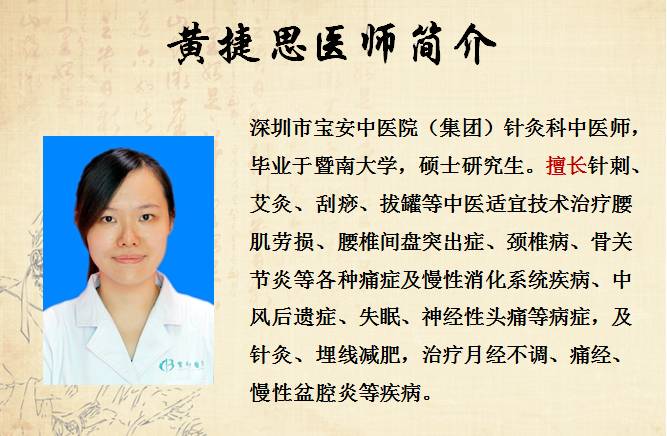 ▲作者:黄捷思 深圳市宝安中医院(集团)针灸科中医师,毕业于暨南大学,硕士研究生。